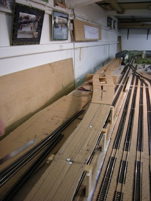 La pose de la voie a débuté ce samedi. Notre objectif est de terminer la pose de toutes les voies afin de "tourner un peu" et de dérouiller le matériel bien sagement rangé dans leurs boites.La pose commence à la sortie du pont cage et progresse en suivant un relief, encore fictif, jusqu'à la rupture de pente et la descente vers la courbe d'entrée en gare (2 modules à réaliser plus un passage amovible).